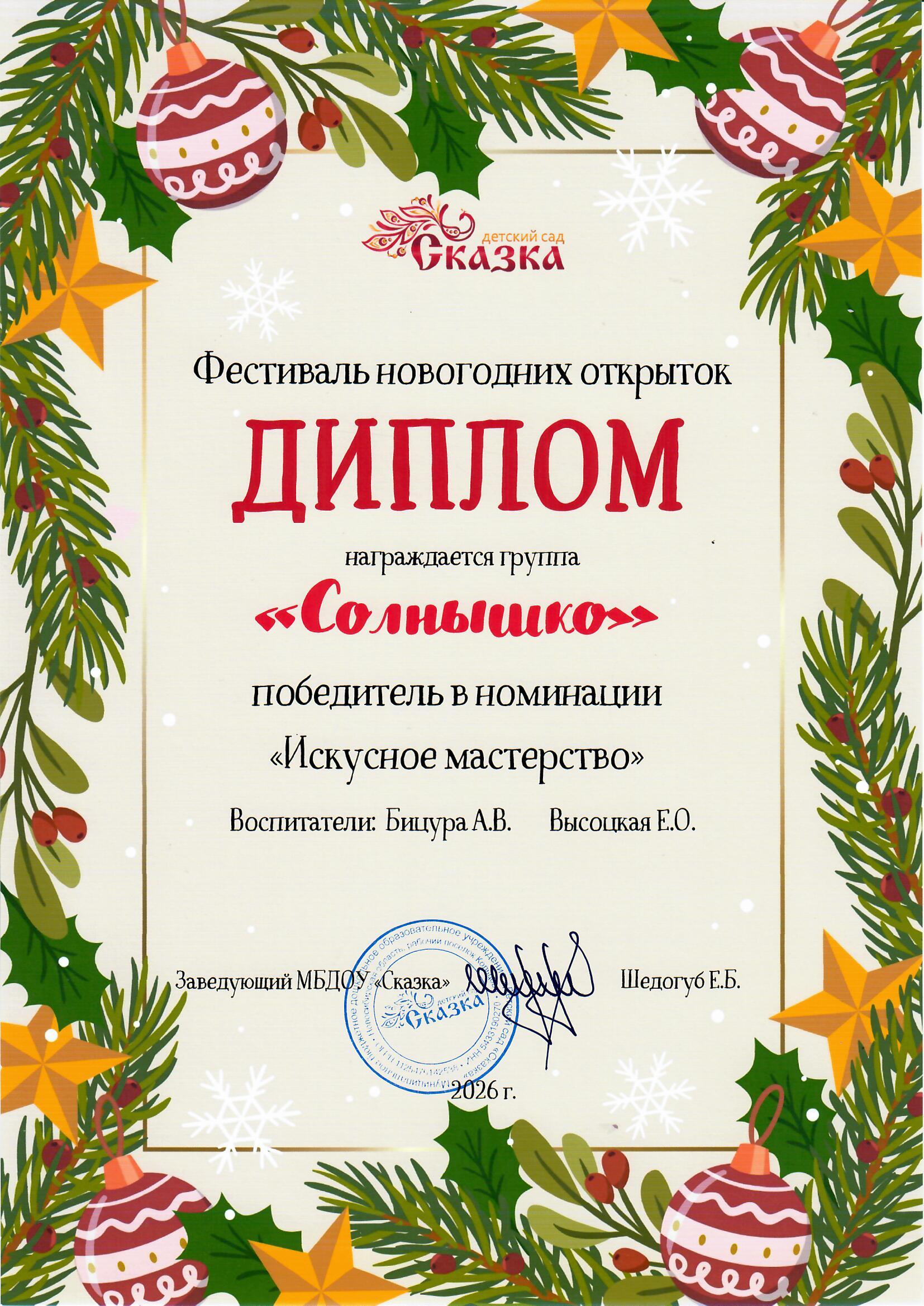 Фестиваль новогодних открыток МБДОУ "Сказка", Диплом победителя в номинации "Искусное мастерство", январь 2026 г.